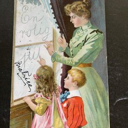 Jenny Nyström .Mor och barn tittar ut genom fönster. svår stämpel Hällabäck 1906