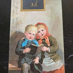 Litet vykort .Flicka och tomtenisse signerat Margit Ekstam