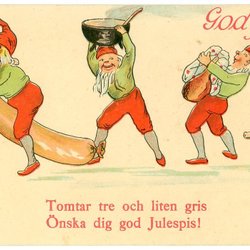 Gammalt Julkort sign HR Med tomtar o gris som bär mat