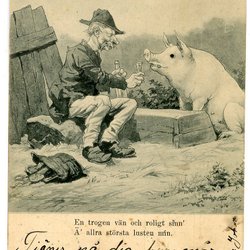 Äldre vykort sign Trn med man som skålar med gris