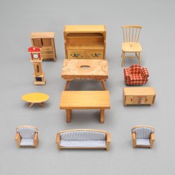 Vintage dockhusmöbler i 12 delar, trämöbler, dockhus, byrå, bord, soffa fåtöljer