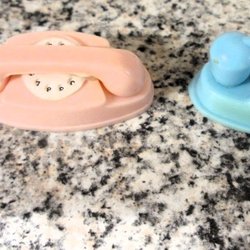 Två olika gamla dock- leksaks telefoner av plast. Barbie-modell