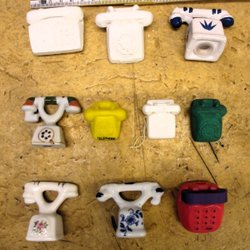 Tio olika dock- leksaks telefoner av olika material.