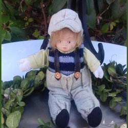 Välekiperad vacker docka pojke med porslinshuvud hängselbyxa Vintage Handgjord