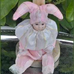 Porslinsdocka Pierrot med tårar välekiperad narr rosa klädsel Vintage 70-tal