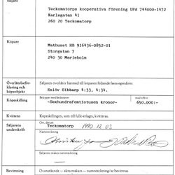 1990 köpebrev, köpeavtal, kvitto, försäljning Teckomatorps konsum, Marieholm