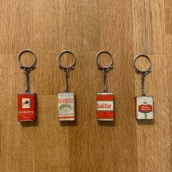 Liten samling äldre nyckelringar med reklam för cigaretter retro