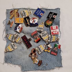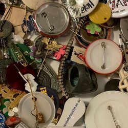 Massor med pins, knappar nyckelringar mm