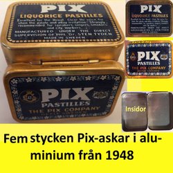 5 st! Plåtburkar PIX Lakrits Pastillesr.ALUMINIUM! export. Från år 1948. 6x4cm