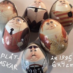 Plåtburk-ar Sex Ägg. Alla 1995 års figurer från Leckerli-Huus, Schweiz.