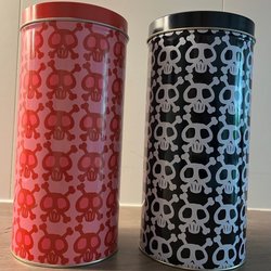 Två dekorativa söta plåtburkar med dödskallar heminredning