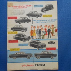 Dubbelsidig helsidesannons Ford 1950‑tal FIB tävling Anglia Zephyr Consul