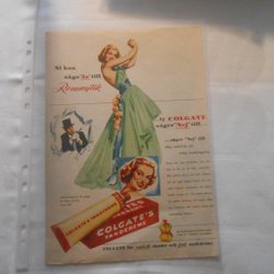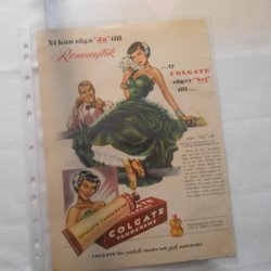 Colgate tandkräm 1950‑tal helsida reklam glamour grön aftonklänning