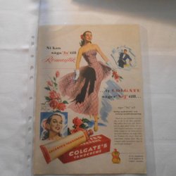Colgate tandkräm 1950‑tal helsida reklam rosa aftonklänning romantik