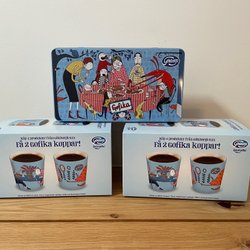 Gofika kaffemuggar och kakburk