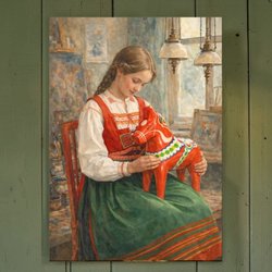 Hård tavla - flicka med dalahäst, Orsa folkdräkt