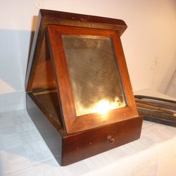 Jättegammal rakspegel låda med 4 Rakknivar
