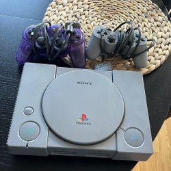 Sony Playstation med 2 handkontroller och minneskort