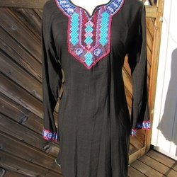 Svart tunika med blå, rosa och lila broderier- Knytband. Stl caM/L. Bomull