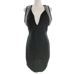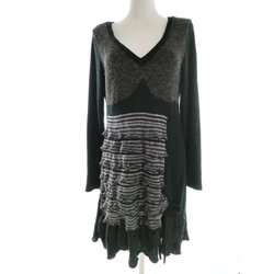 Dam Stickad Klänning 38 Svart Akryl 100% Lång ärm Broderi Ränder Knälängd