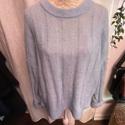 Blå stickad långtröja med fransar längst ner på framsidan. Passar strl M.
