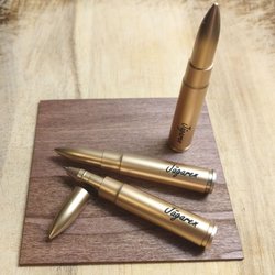 Graverad nyckelring med penna i form av en patron
