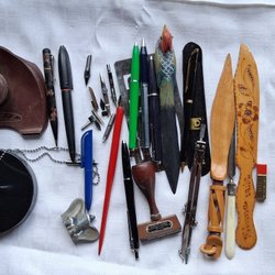 Bra parti kuriosa många pennor, skrivstil, stämpel, passare, stift brevknivar mm