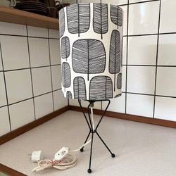 Stringlampa med svart trebent och nytillverkade lampskärm