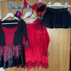Halloween jul - röd djävulsklänning m diadem svartröd o kjol stl 98 hattar