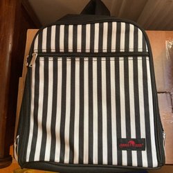 Mormors oanvända, svarta/vinröda/beige ryggsäck. Ej uppackad. Mått: 36x26x9,5 cm