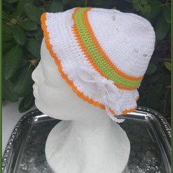 Sommarhatt solhatt solskydd virkad i vitt grönt och orange åtdragbar band