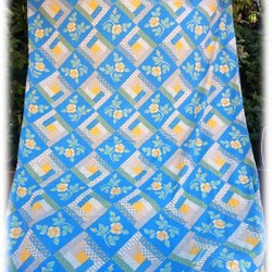 Vackert påslakan med gula rosor mot blå rutad bakgrund Så vackert i vintage