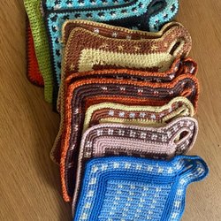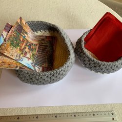 Handgjorda virkade korgar för servetter eller småprylar.