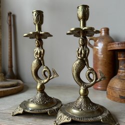 Antika ljusstakar i mässing med sjöjungfrur