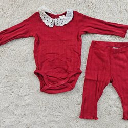 Juligt rött set, strl 68, julröd body och leggings, mönstrad ribbad trikå, spets