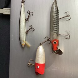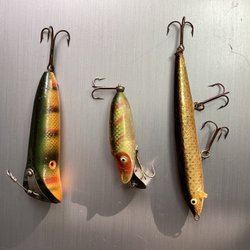 Äldre fiskepluggar i trä + 2 plast