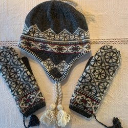 Grå mössa och vantar set med traditionellt mönster, storlek XL