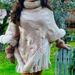 Beige grovstickad poncho med päls ny!