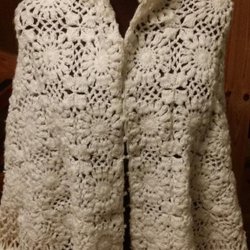 Grå/vit sjal virkad med volang garn, hemvirkad, scarf, volanggarn, paljetter