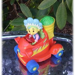 Gullan ur Fifi med blomsterfröna i bil på batterier med högtalare