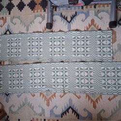 Två hemvävda löpare, dukar, med geometriskt mönster i grönt.