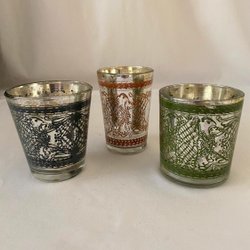 3 st ljuslyktor i silverfärgat glas. Grön,röd,marinblå. 9 cm höga. 8 cm i diam.