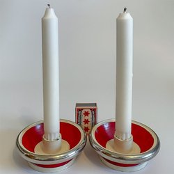 Ett par vintage metall ljusstakar med röd och vit emaljfärg