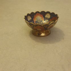 Metallskål med mönster i emalj.Höjd 6 cm, diameter 12 cm.