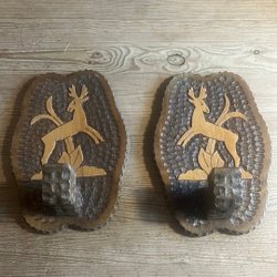 Väggljusstakar i trä med hjorts motiv lampetter hantverk gamla