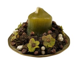 Small Decorative Candle with Metal Base and Floral Accents