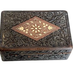 Antik handgjord trälåda med sniderier och inläggningar