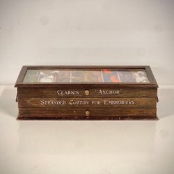 Syskrin Clarks "Anchos" 1900-talets mitt Låda Glas Trä Inklusive Sytråd (D3)