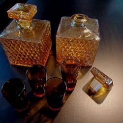 Karaffer med snapsglas. Bärnstensfärg.