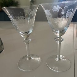 Två stycken vintage vinglas med dekorativ design.